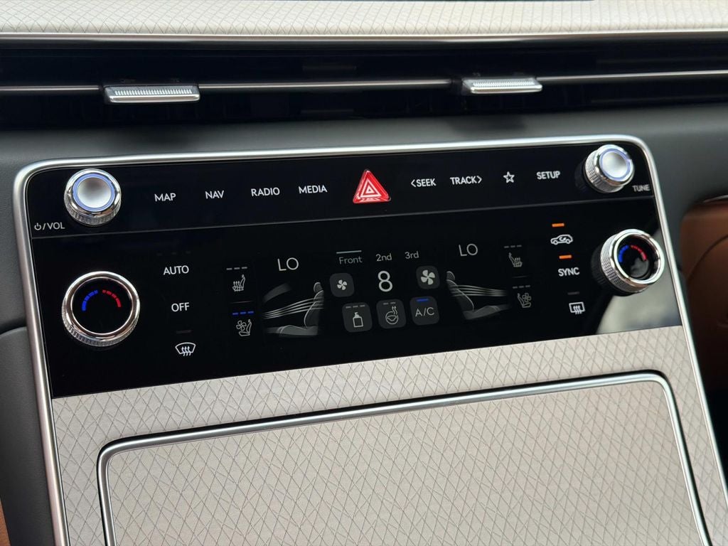 Green 2026 Genesis GV80 18 Speakers, 3rd row seats: split-bench, 4-Wheel Disc Brakes, ABS brakes, Adaptive suspension, Air Conditioning, Alloy wheels, AM/FM radio: SiriusXM, Anti-whiplash front head restraints, Auto High-beam Headlights, Auto tilt-away steering wheel, Auto-dimming door mirrors, Auto-dimming Rear-View mirror, Automatic temperature control, Brake assist, Bumpers: body-color, Cargo Net, Compass, Delay-off headlights, Driver door bin, Driver vanity mirror, Dual front impact airbags, Dual front side impact airbags, Electronic Stability Control, Emergency communication system: Genesis Connected Services, Exterior Parking Camera Rear, First Aid Kit, Four wheel independent suspension, Fragrance Cartridge, Front and Rear Mudguards, Front anti-roll bar, Front Bucket Seats, Front Center Armrest, Front dual zone A/C, Front reading lights, Fully automatic headlights, Garage door transmitter: HomeLink, Genuine wood console insert, Genuine wood dashboard insert, Genuine wood door panel insert, Heads-Up Display, Heated and Ventilated Front Bucket Seats, Heated door mirrors, Heated front seats, Heated rear seats, Heated steering wheel, Illuminated entry, Knee airbag, Leather steering wheel, Low tire pressure warning, Memory seat, Nappa Leather Seating Surfaces, Navigation System, NFC Key Card, Occupant sensing airbag, Option Group 01, Outside temperature display, Overhead airbag, Overhead console, Panic alarm, Passenger door bin, Passenger vanity mirror, Power door mirrors, Power driver seat, Power Liftgate, Power moonroof, Power passenger seat, Power steering, Power windows, Radio data system, Radio: AM/FM/HD Bose Premium Sound System, Rain sensing wipers, Rear air conditioning, Rear anti-roll bar, Rear reading lights, Rear seat center armrest, Rear side impact airbag, Rear window defroster, Rear window wiper, Reclining 3rd row seat, Remote keyless entry, Roof Rack Cross Bars, Security system, Speed control, Speed-sensing steering, Speed-Sensitive Wipers, Split folding rear seat, Spoiler, Steering wheel memory, Steering wheel mounted audio controls, Tachometer, Telescoping steering wheel, Tilt steering wheel, Traction control, Trip computer, Turn signal indicator mirrors, Variably intermittent wipers, Ventilated front seats, Ventilated rear seats, Wheels: 22 x 9.5J Dark Gray Matte Alloy.